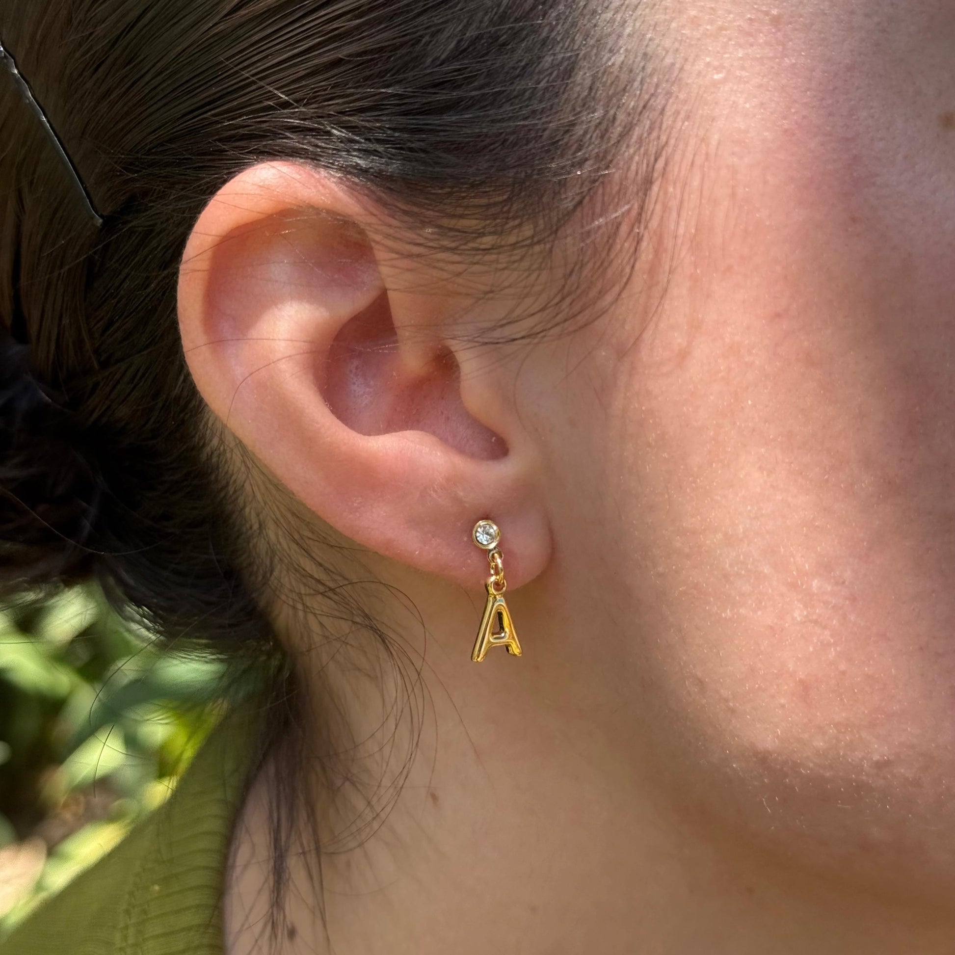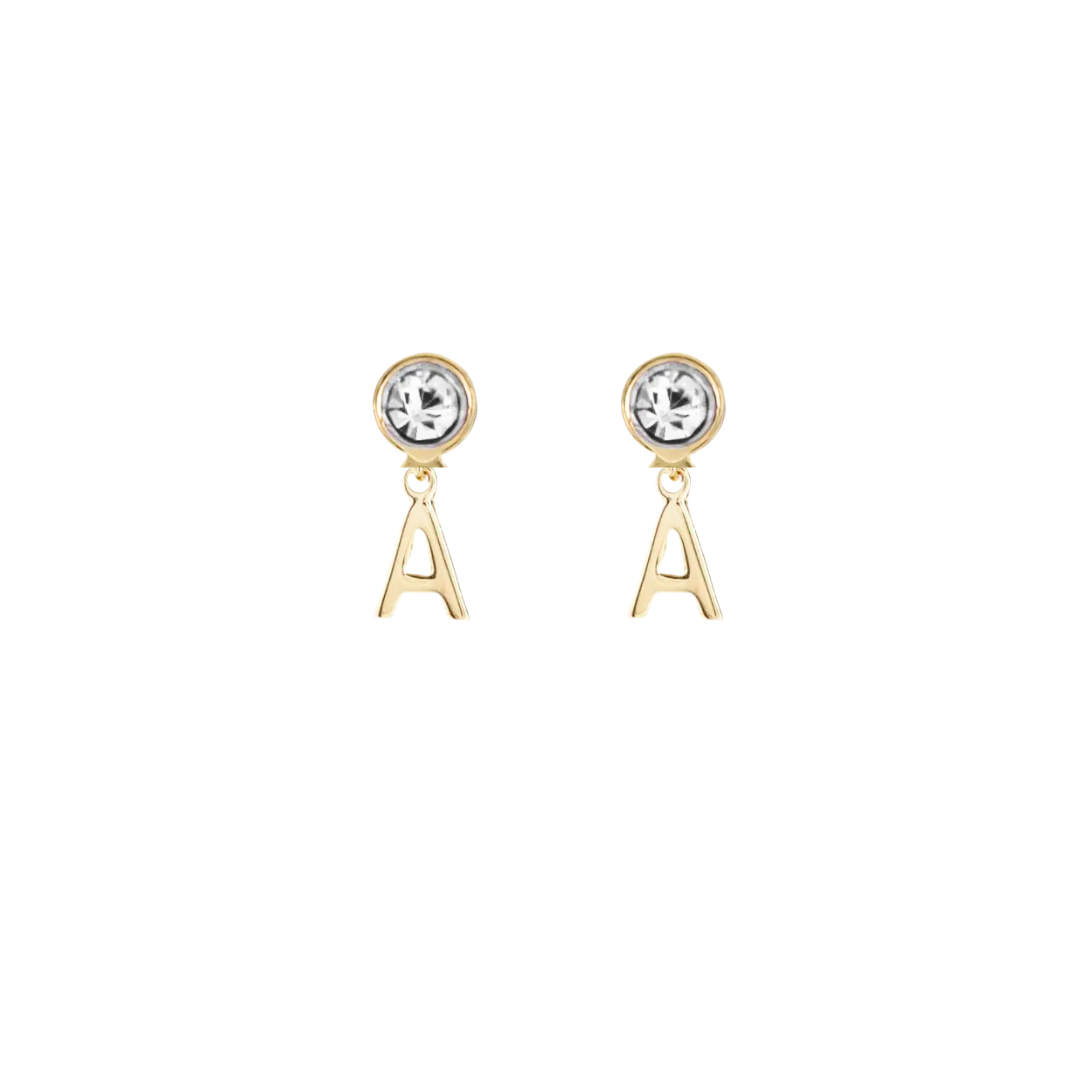 Un detalle con significado. Aretes con tu inicial y cristal, en chapa de oro 22k. Personaliza tu estilo con brillo y elegancia.