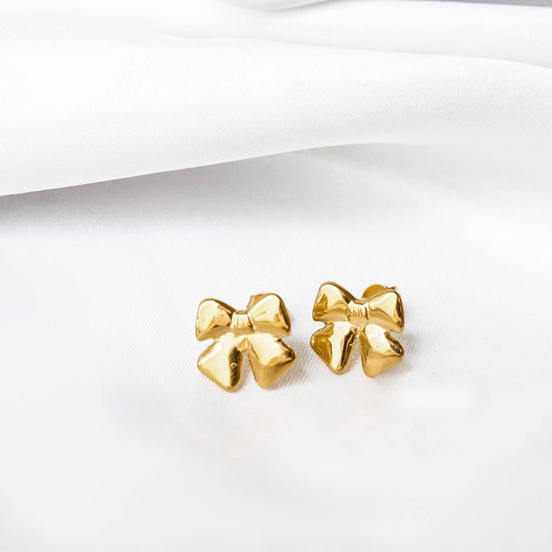 Delicadeza que resalta. Aretes de moño en listón, bañados en chapa de oro 22k. Sutiles, femeninos e ideales para cualquier ocasión.