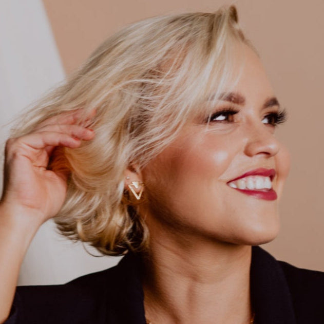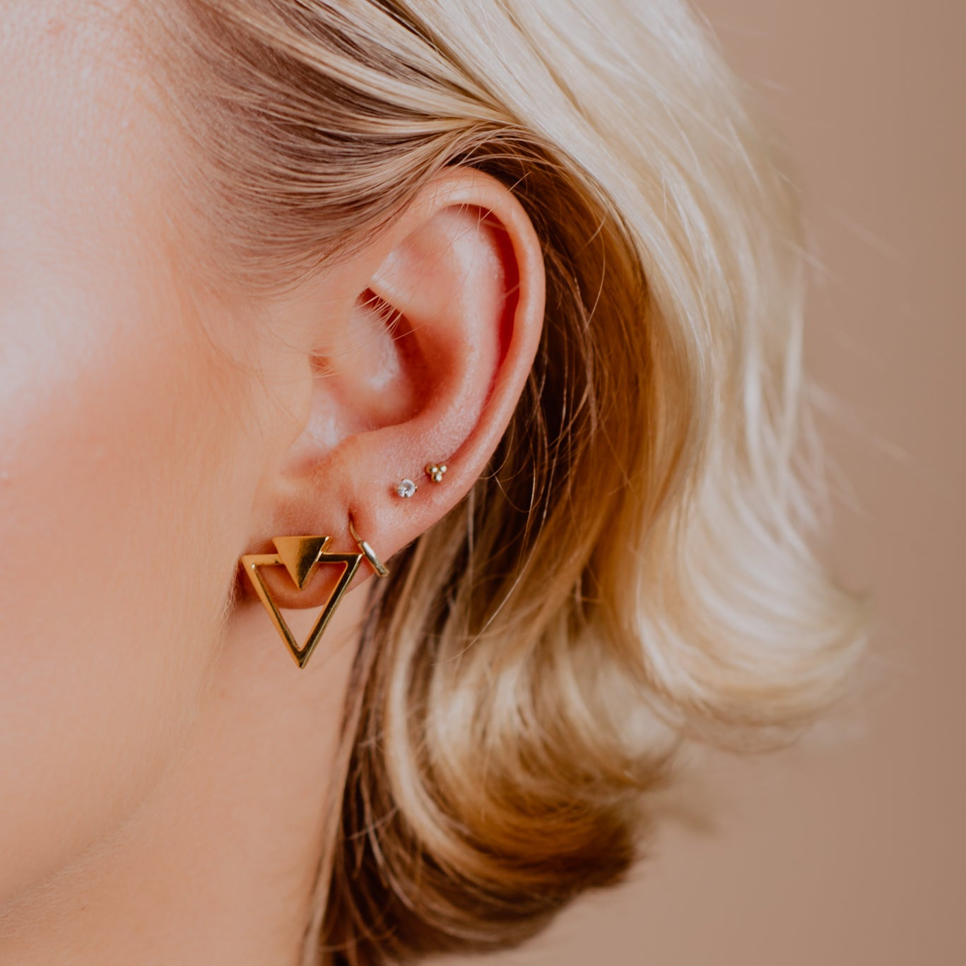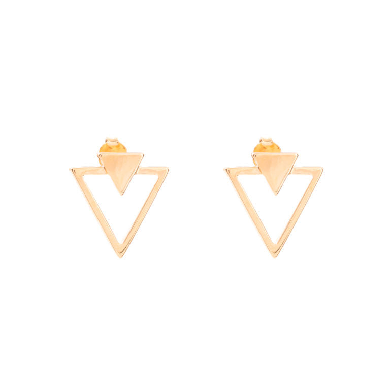 Geometría y estilo en armonía. Nuestro arete triángulo doble en chapa de oro de 22k es el accesorio perfecto para quienes buscan un toque moderno y sofisticado