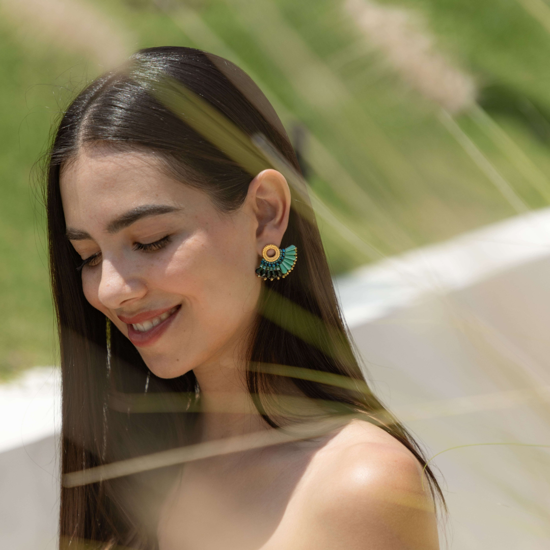 Inspirados en la naturaleza mexicana, los Aretes Nayara reflejan la frescura del verde y el brillo del sol en su chapa de oro 22k.