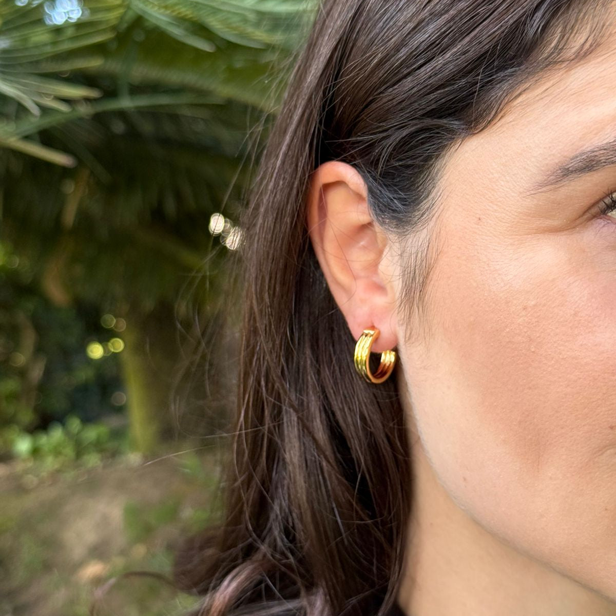 Los aretes Paulina, elaborados en chapa de oro 22K, son la opción perfecta para el día a día. Con un diseño elegante y sofisticado, añaden un toque de luminosidad a cualquier look, sin perder la comodidad. Ideales para acompañarte en tu rutina diaria, combinando estilo y versatilidad
