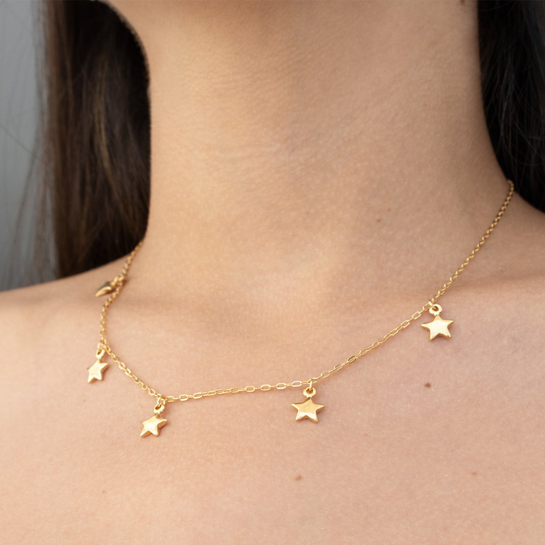 Un tributo al brillo del firmamento. Este collar, con cinco estrellas delicadamente alineadas, ilumina tu estilo con un toque celestial. Ideal para quienes buscan destacar con una joya única y elegante.
