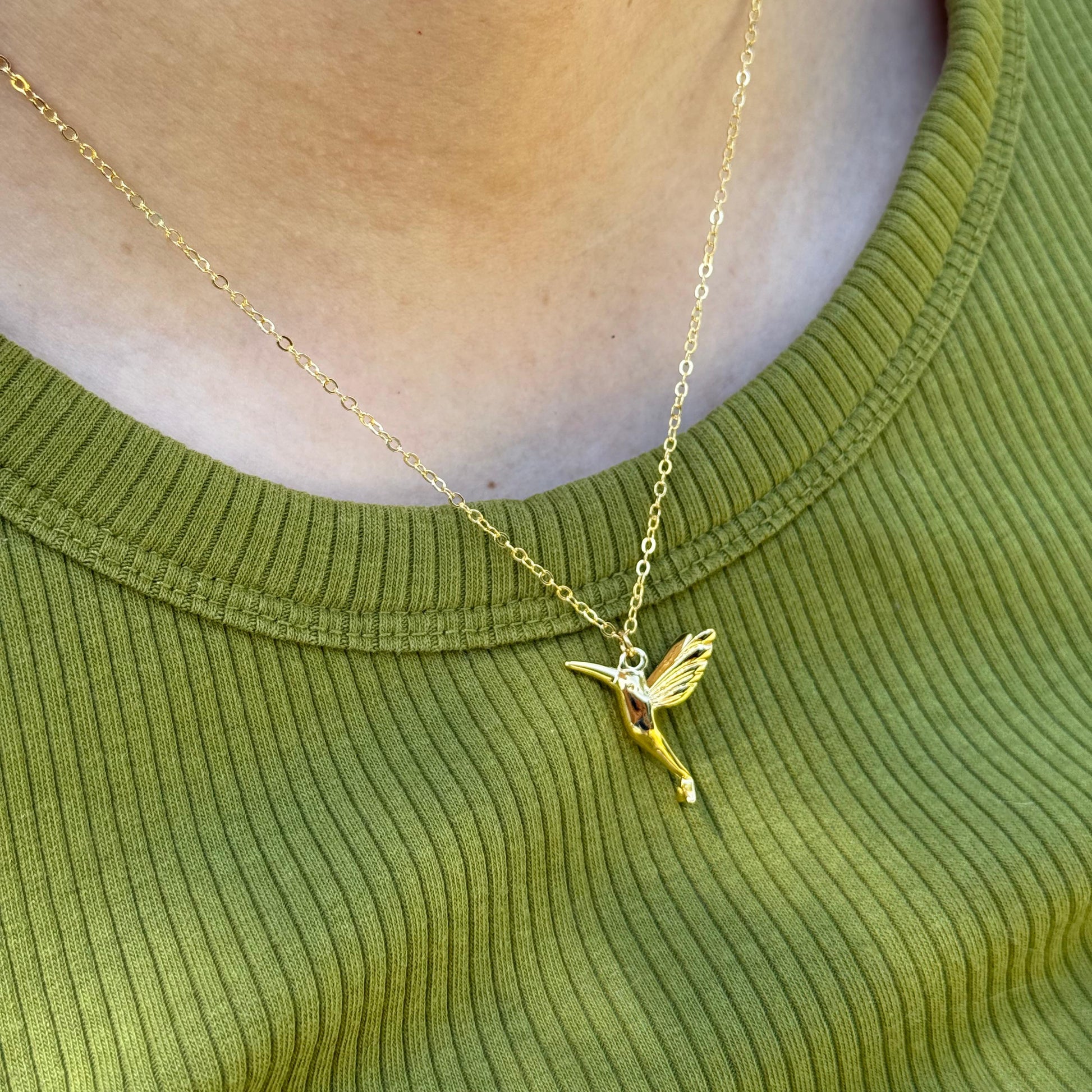Libera tu energía con nuestro collar de colibrí en chapa de oro de 22k. Un diseño vibrante y elegante que captura la esencia de la belleza y la libertad.