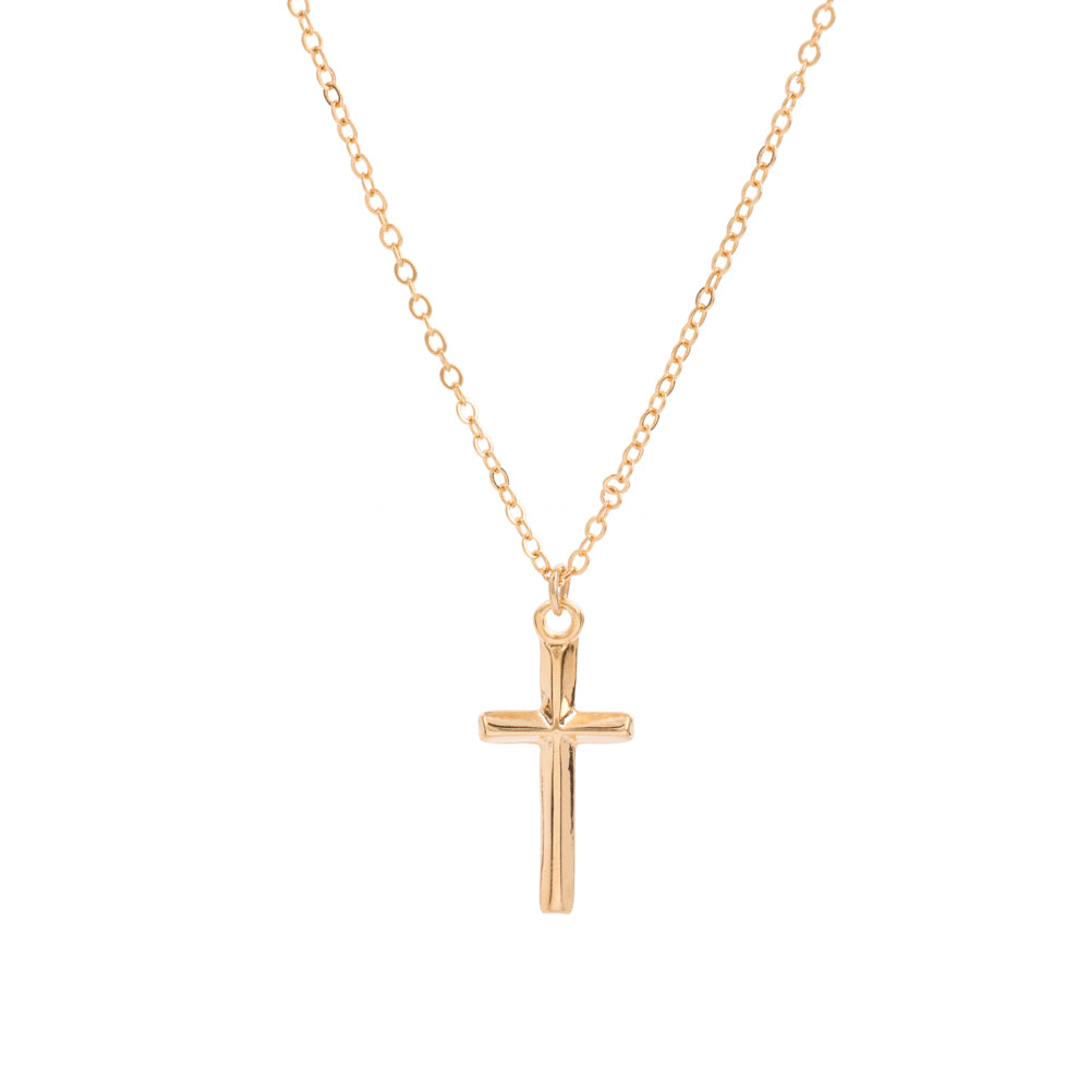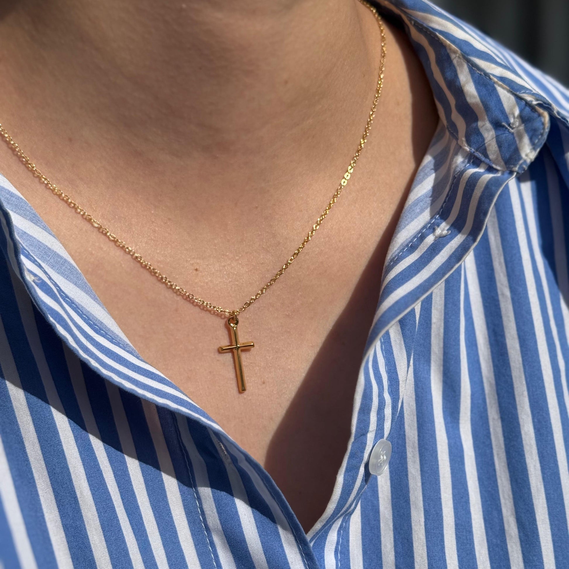 Lleva la fe y el estilo contigo. Nuestro collar de cruz en chapa de oro de 22k es el complemento perfecto para un look lleno de significado y elegancia.