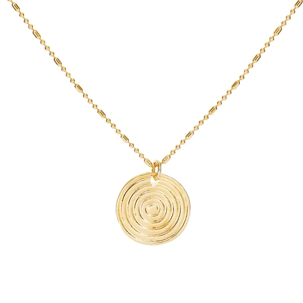 Un diseño que representa caminos, decisiones y descubrimientos. Este collar de laberinto en chapa de oro de 22 quilates es una pieza única que combina significado y estilo con un acabado brillante.