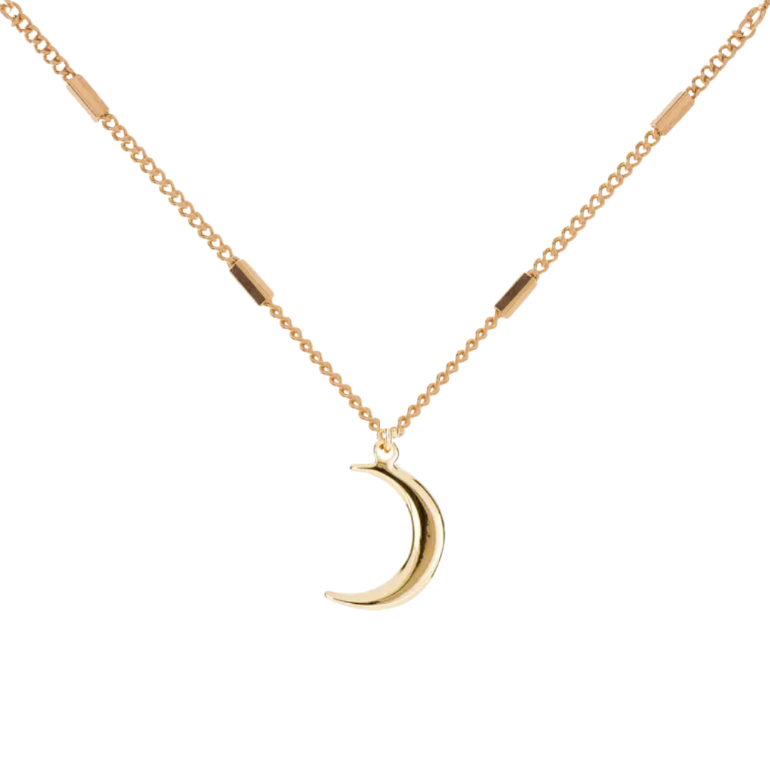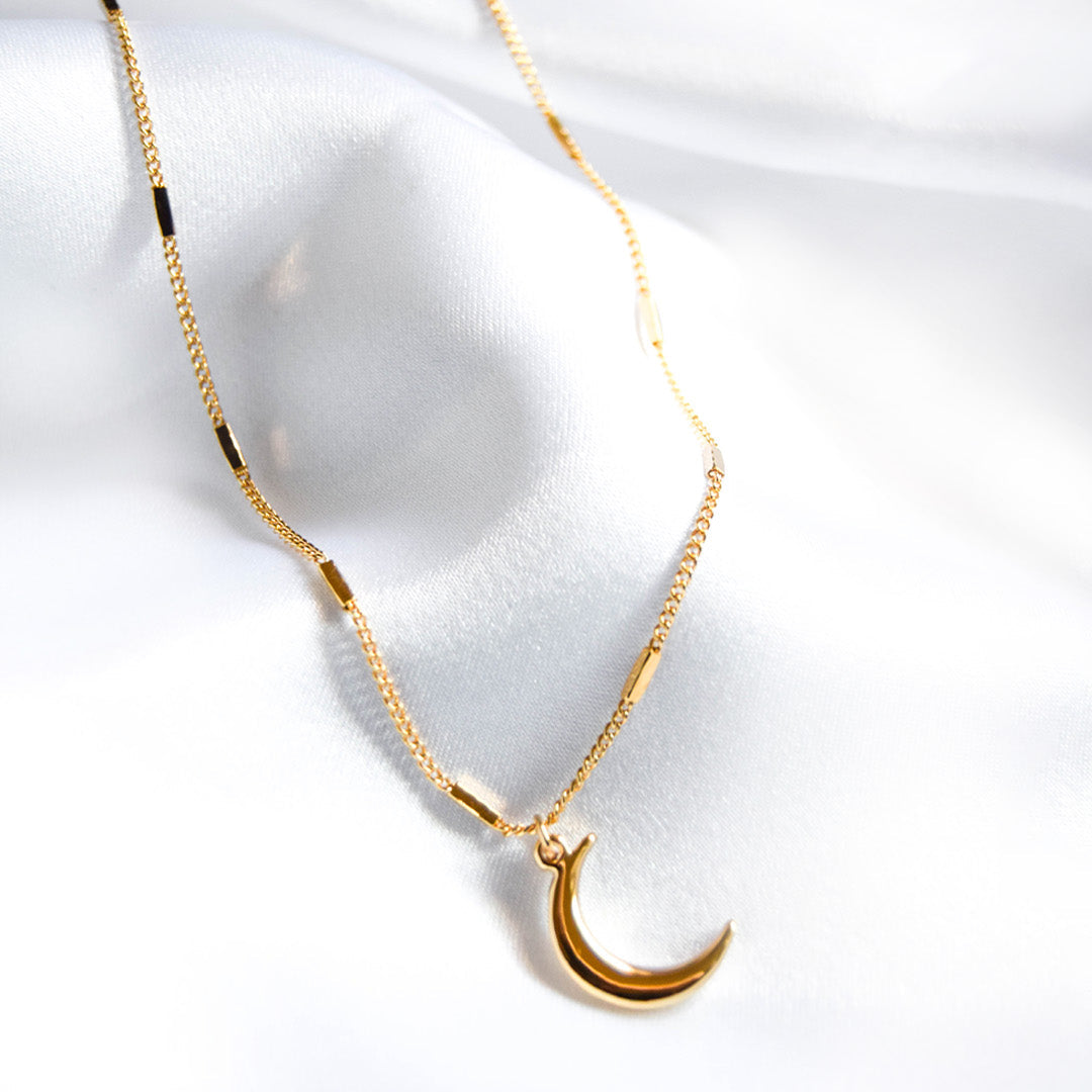 Un diseño delicado y lleno de significado. La luna menguante se acompaña de una cadena barbada con barritas, creando una pieza elegante y versátil para llevar todos los días.
