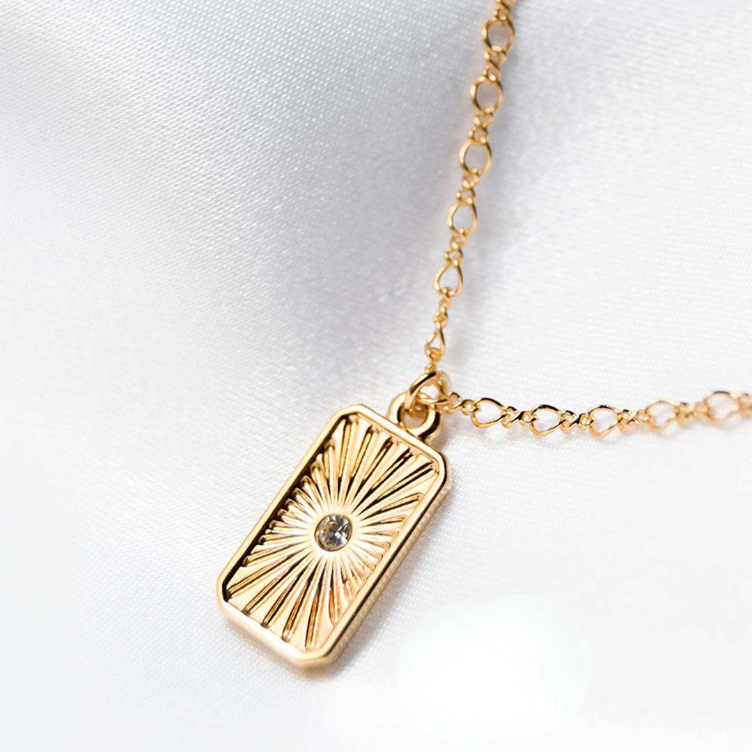 Brilla con estilo y sofisticación. Nuestro collar de medalla con destello de cristal en chapa de oro de 22k es el accesorio perfecto para agregar un toque de luz y elegancia a tu look.