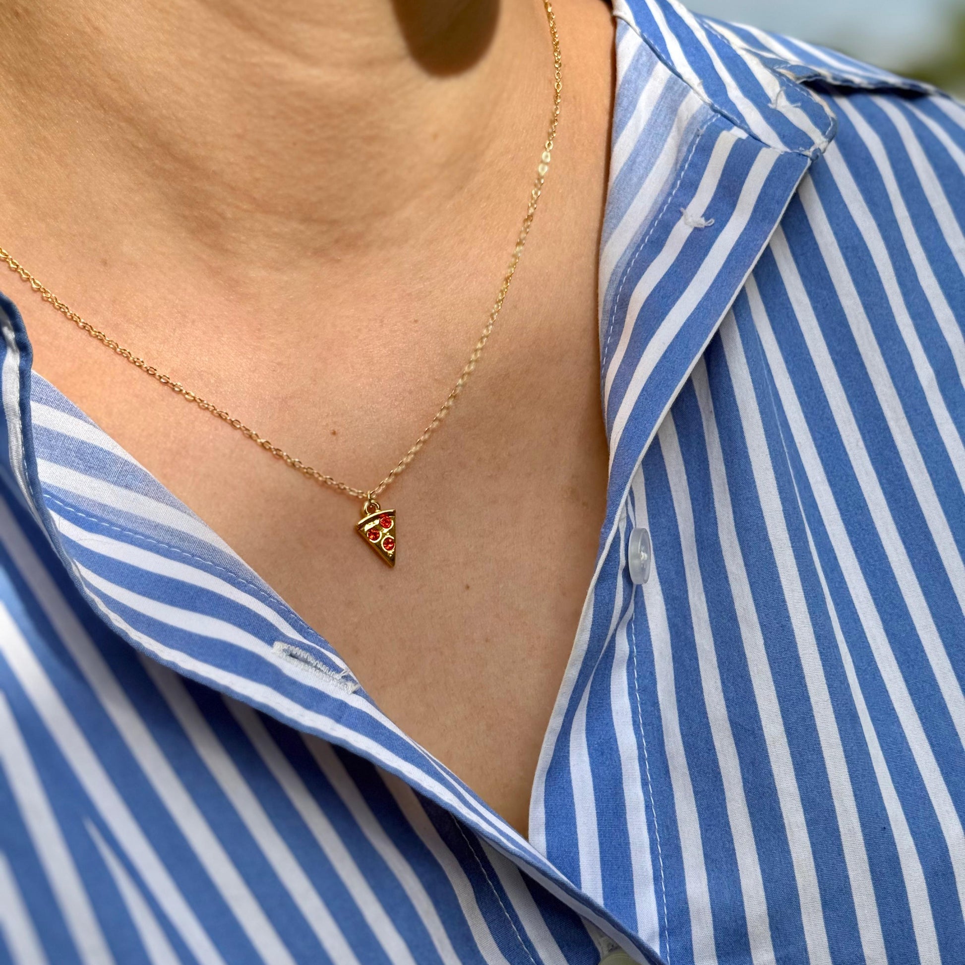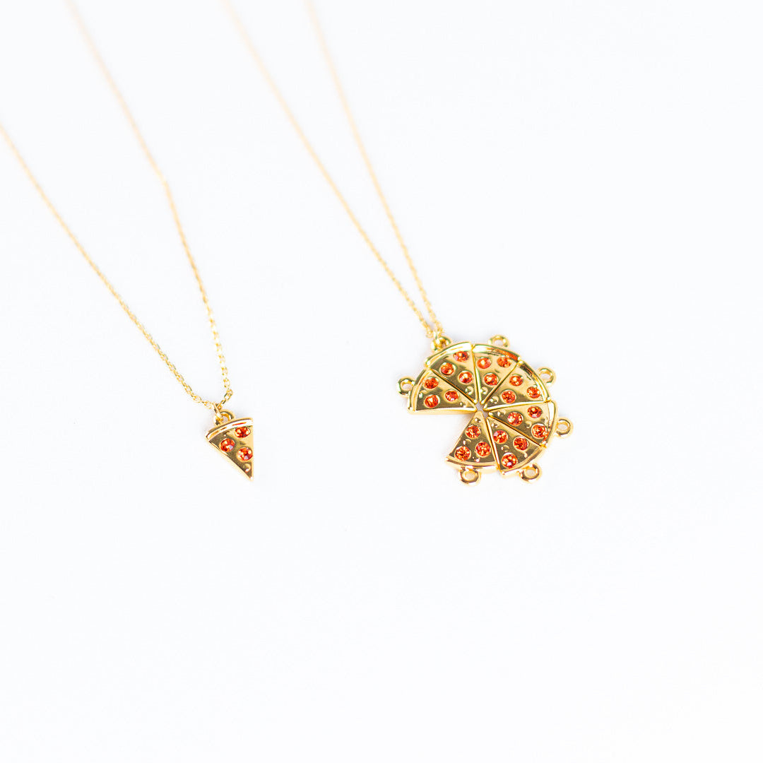 Comparte un pedazo de amor. Nuestro collar de pizza de pepperoni en chapa de oro de 22k es el regalo perfecto para tu mejor amigo, amiga o pareja, simbolizando la conexión única que los une.