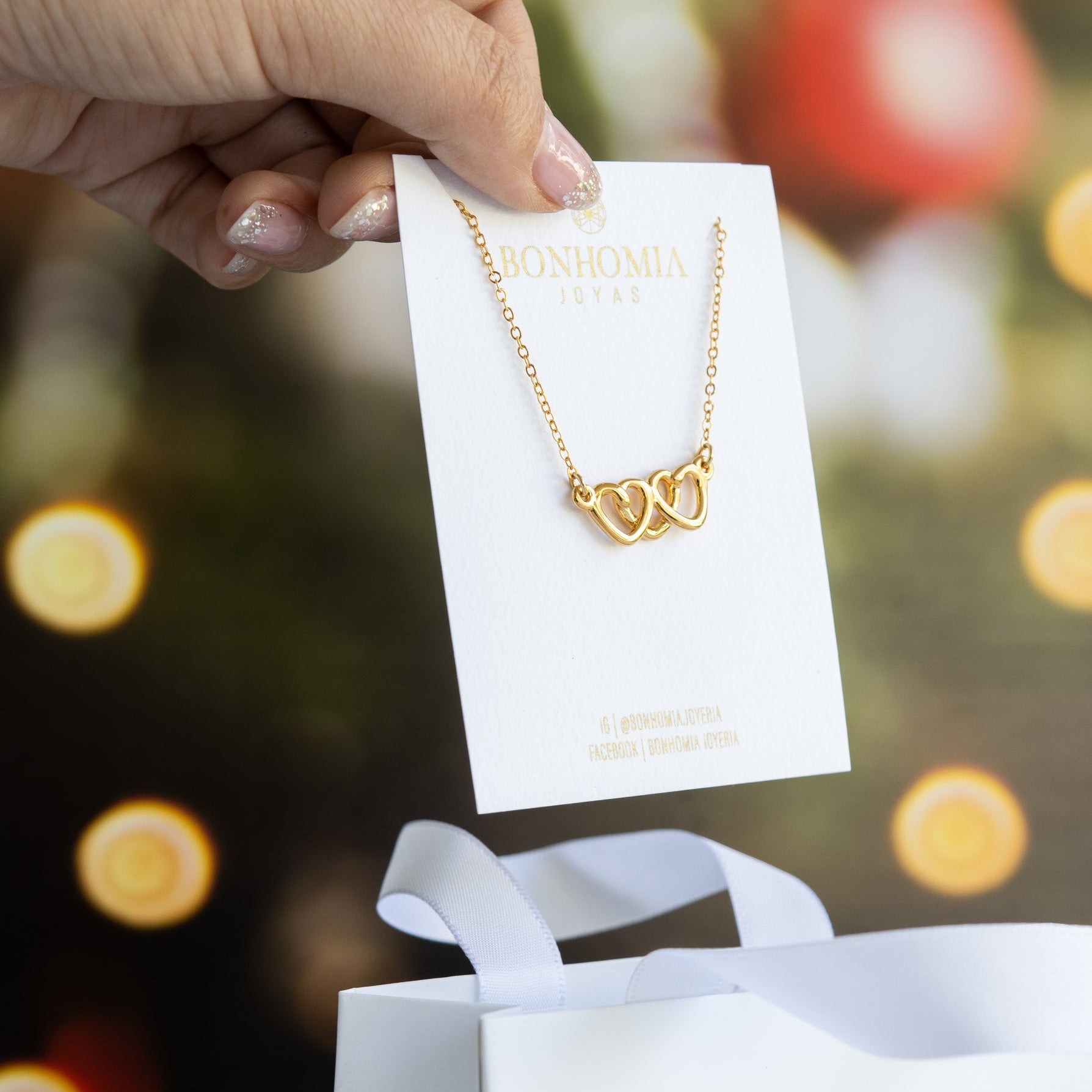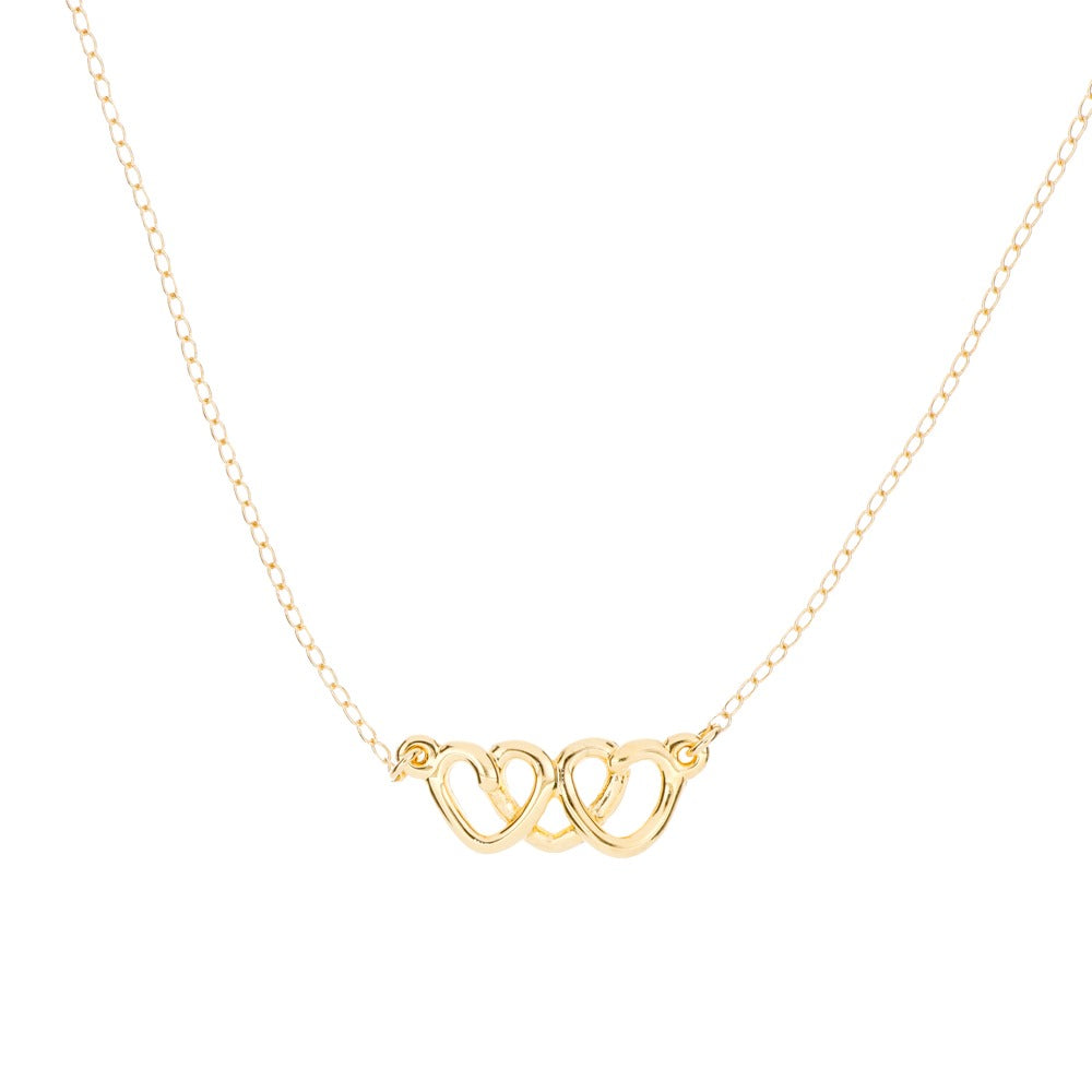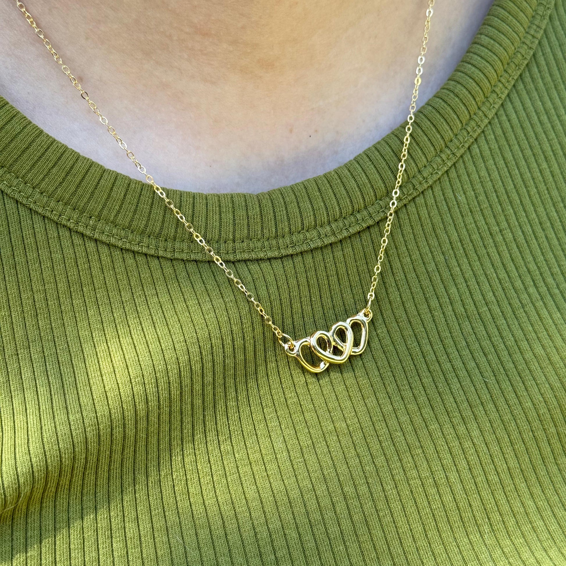 Un amor que se une en tres. Nuestro collar de tres corazones unidos en chapa de oro de 22k simboliza la conexión eterna y el cariño profundo.