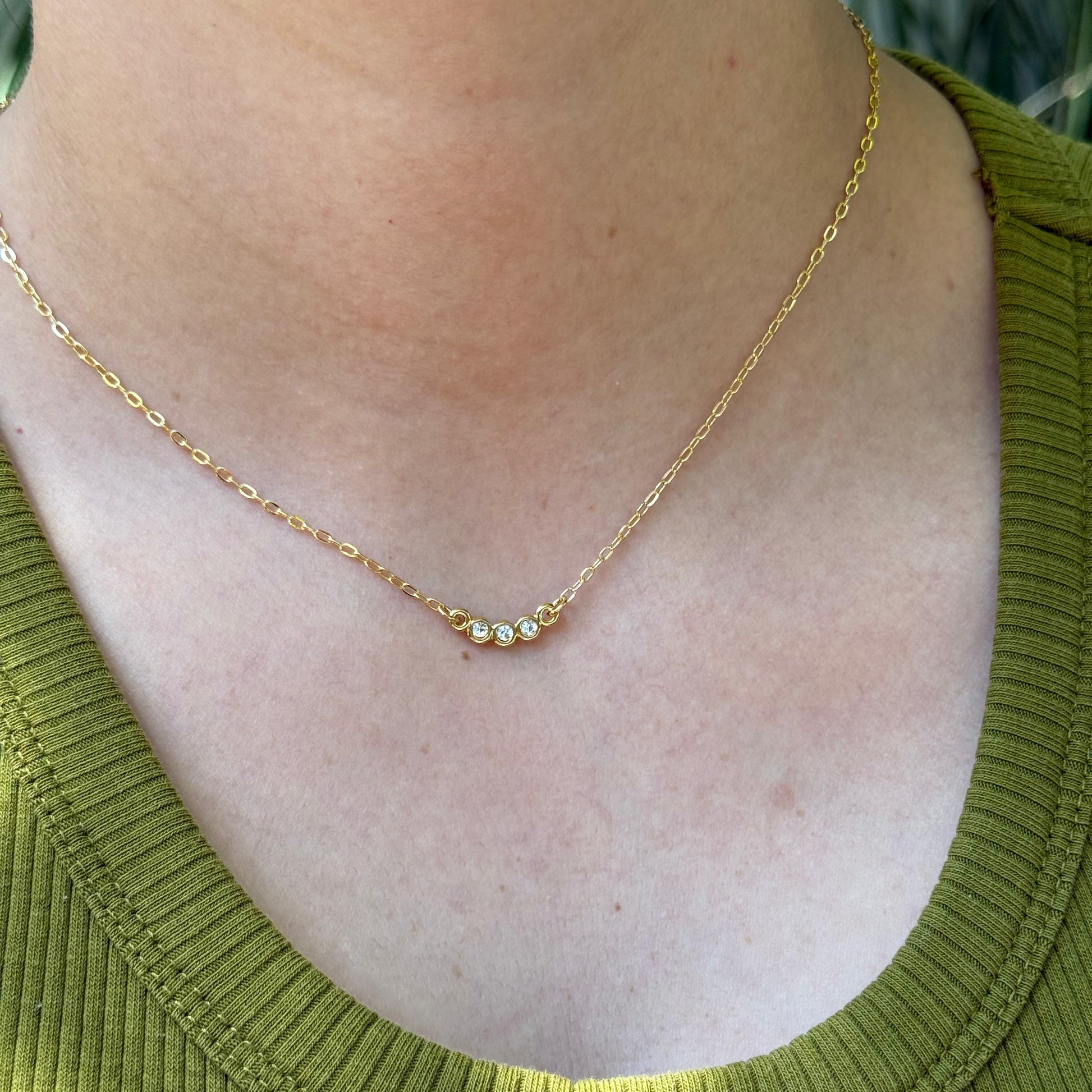 El collar Tres Destellos es la pieza perfecta para quienes buscan sofisticación y versatilidad en sus accesorios. Con tres cristales delicadamente dispuestos, este collar en Chapa de oro 22K refleja luz de manera única, creando destellos sutiles que realzan tu estilo. Su diseño elegante y minimalista lo convierte en la opción ideal para layering, permitiendo combinarlo fácilmente con otras piezas y crear un look personalizado y lleno de carácter.
