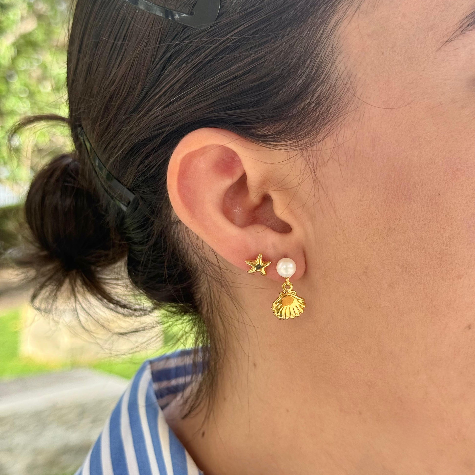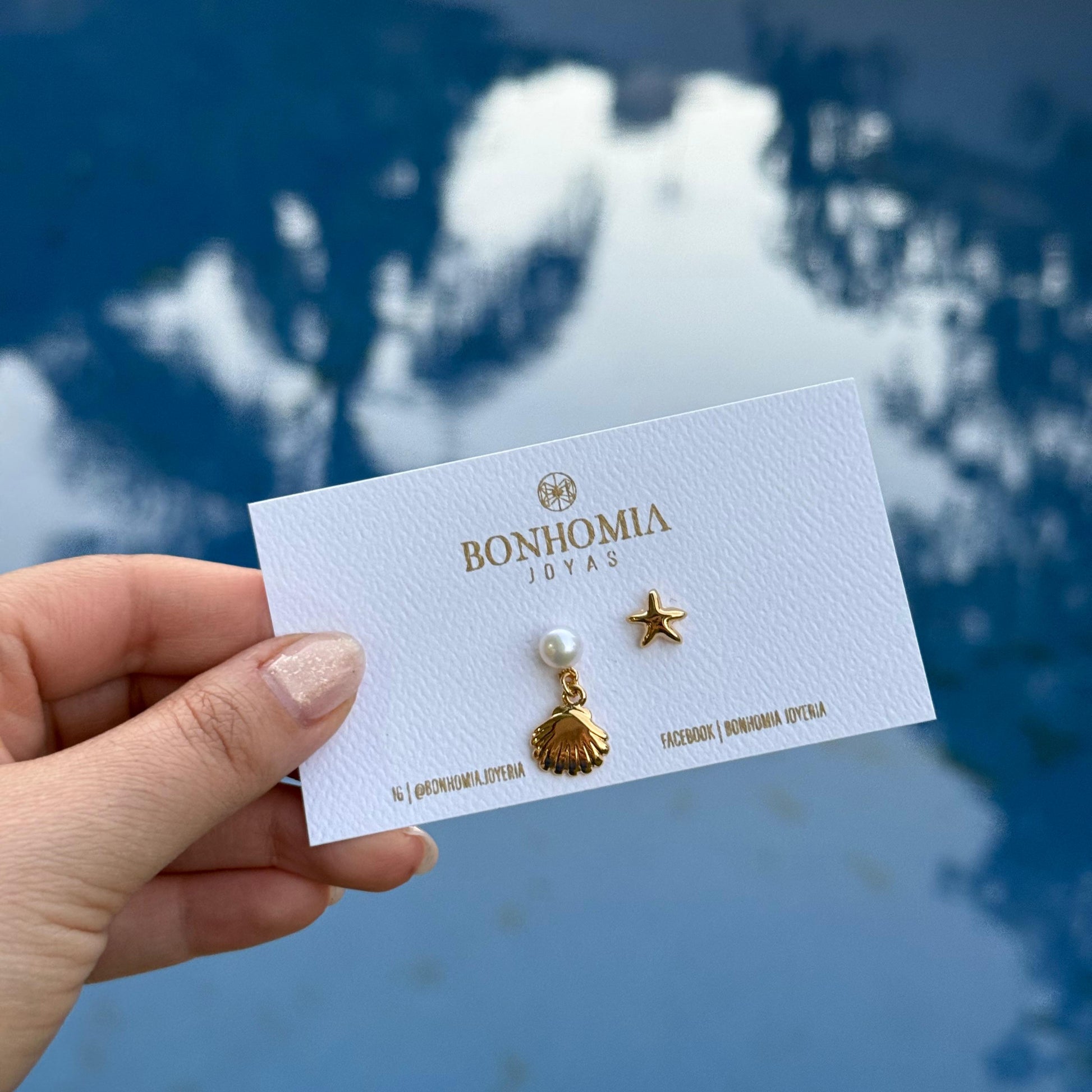 Inspirado en el mar y sus tesoros. Este set combina la elegancia de la perla, la delicadeza de la concha y la magia de la estrella de mar, todo en chapa de oro 22k. Perfecto para llevar el espíritu del océano contigo, siempre.