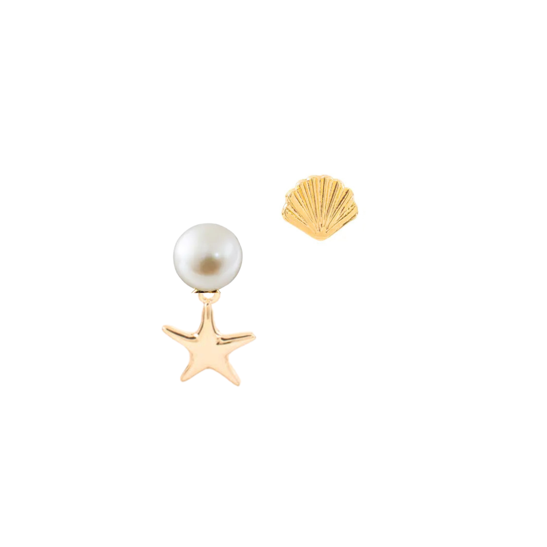Set Inspirados en el océano y hechos a mano en México, estos aretes combinan perlas naturales con delicadas figuras de estrella y concha de mar. Un diseño que refleja la belleza marina con un toque artesanal único.